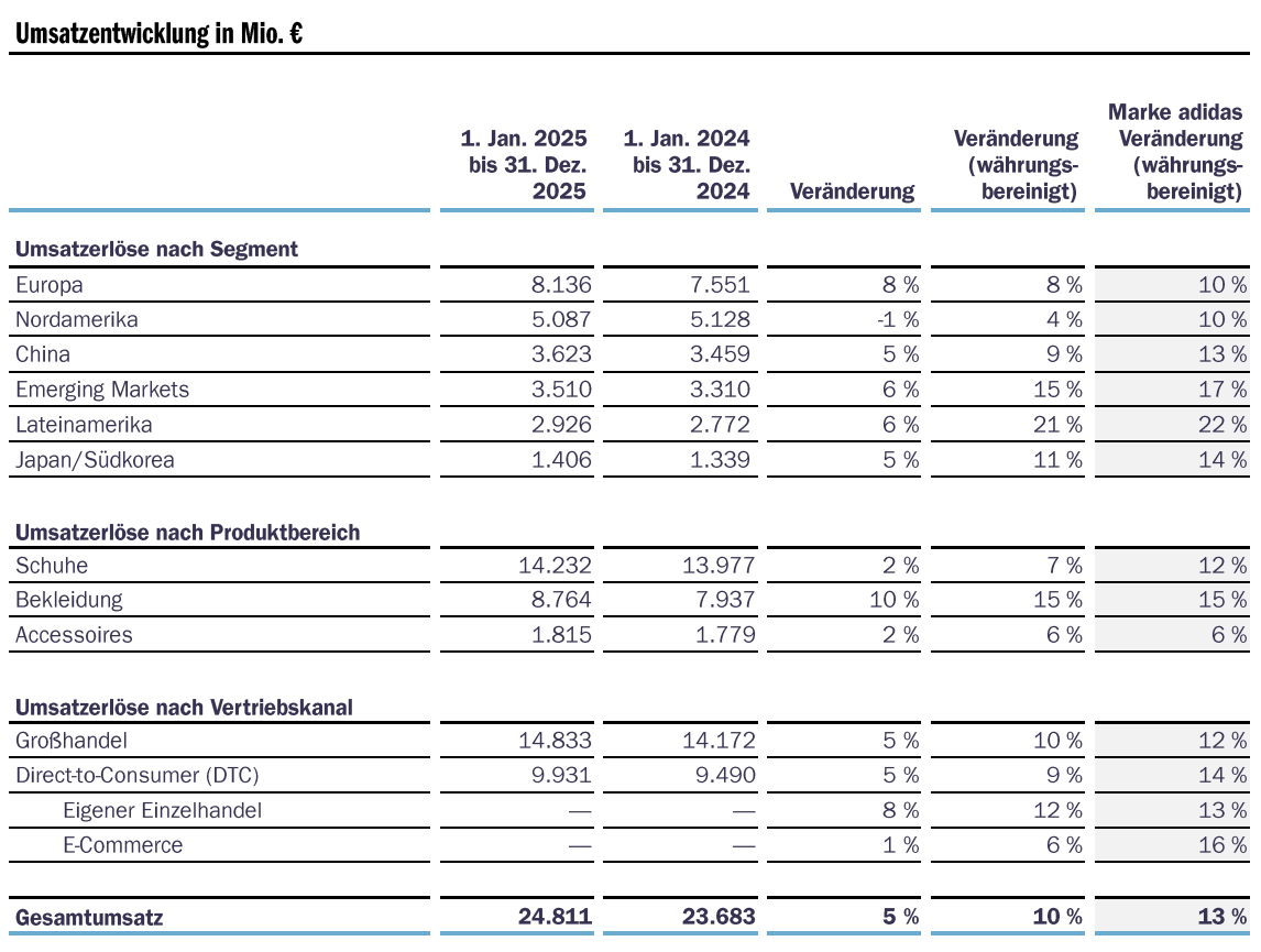 Im Jahr 2025 stieg der währungsbereinigte Umsatz der Marke adidas in allen Märkten im zweistelligen Prozentbereich. Dieser Anstieg spiegelt die bedeutenden Gewinne an Marktanteilen weltweit wider, die durch eine Bündelung der globalen Stärke der Marke mit lokal relevanten Produktsortimenten und Aktivierungen erzielt wurden. Europa (+10 %), Nordamerika (+10 %) und China (+13 %) erzielten im Jahr 2025 ein Wachstum im niedrigen zweistelligen Prozentbereich. Lateinamerika (+22 %), Emerging Markets (+17 %) und Japan/Südkorea (+14 %) verzeichneten ein noch schnelleres Wachstum. In allen Märkten war das Wachstum breit gefächert, was sich in starken Zuwächsen sowohl im Großhandels- als auch im Direct-to-Consumer-(DTC-)Geschäft widerspiegelt.