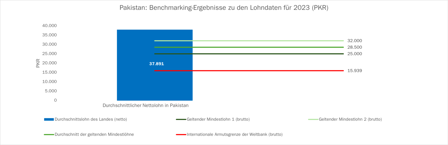 Die Fabriken unserer Stichprobe befinden sich in derselben Provinz und müssen dieselben Mindestlohnanforderungen erfüllen. Es ist wichtig zu beachten, dass Pakistan eine zweistellige Inflationsrate verzeichnete, die die von der Regierung vorgeschriebenen Mindestlohnanpassungen überstieg. Die Datenerhebung für 2023 zeigt, dass die Nettolöhne beide geltenden Benchmarks wie folgt übertrafen: