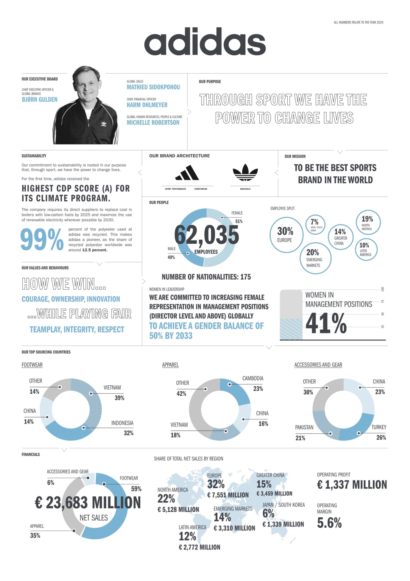 Athletes do not settle for average. And neither do we. We have a clear mission: To be the best sports brand in the world. Every day, we come to work to create and sell the best sports products in the world, and to offer the best service and consumer experience – and to do it all in a sustainable way. We are the best when we are the credible, inclusive, and sustainable leader in our industry.