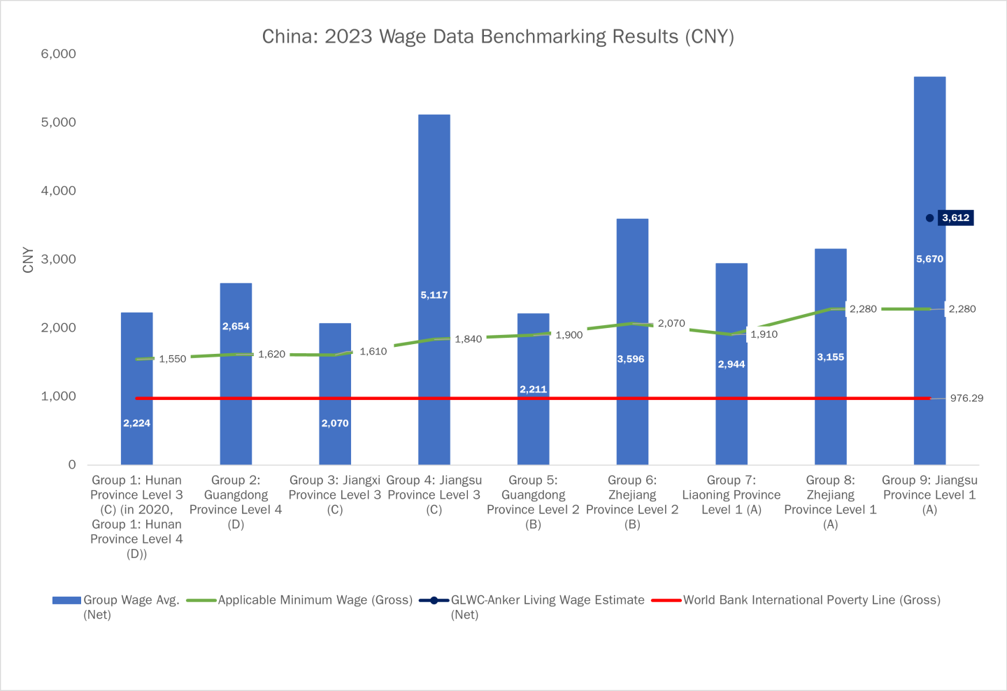 The factories within our data collection scope sit within nine different minimum wage groups. Due to the deactivation of one factory, there is one minimum wage group fewer than in 2020. In 2023, minimum wage requirements in China ranged widely from between CNY 1,550 to CNY 2,280.