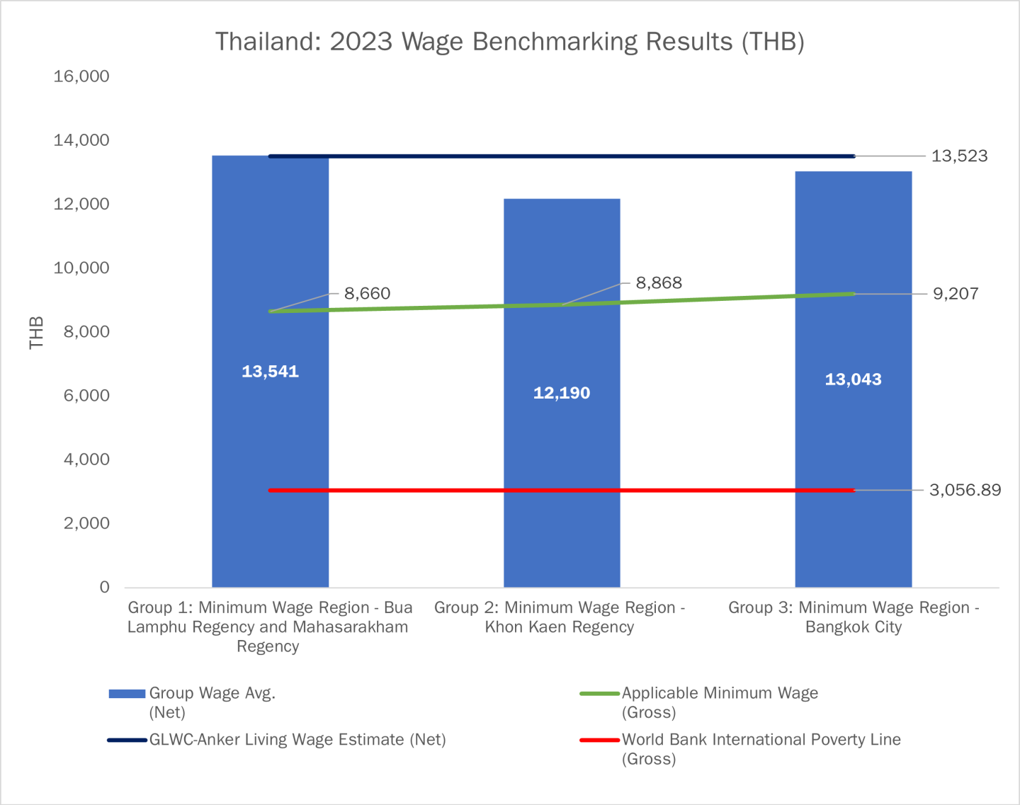 Note: The minimum wage in Thailand is officially calculated as a daily rate. For reporting and tracking purposes, we have calculated a monthly rate based on the daily rate using the same formula as the FLA: [the number of working days in the year multiplied by the daily rate] divided by 12 months in a year. Factories within our data collection scope sit within three different minimum wage requirement groups in Thailand. Minimum wage requirements ranged from 332 THB/day to 353 THB/day.